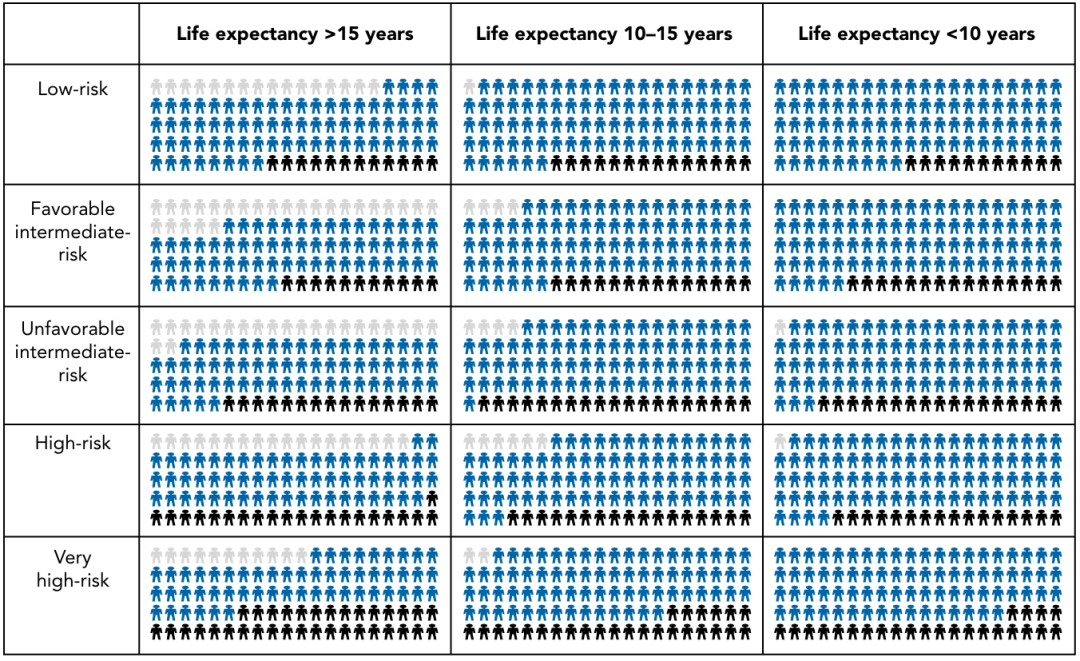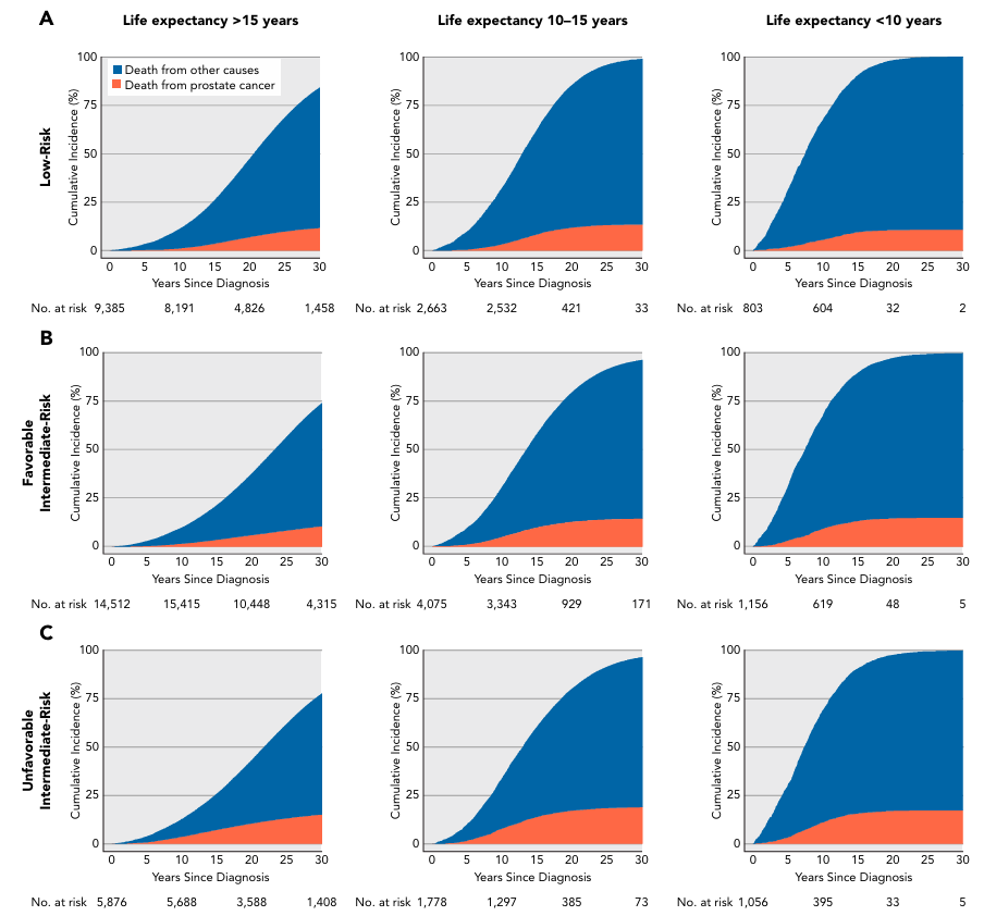 在每个风险类别中,前列腺癌死亡率和其他原因死亡率均随预期寿命而变化。例如,对于低危患者,15年前列腺癌死亡率为2.5%~10%,而对于预期寿命>15年和<10年的男性,其他原因导致的死亡率变化范围为20%~81%。