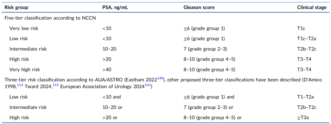 前列腺癌的疾病分期,可参考美国癌症联合委员会(AJCC)《癌症分期手册》2018年第8版。风险分层如下表所示,NCCN分为极低危、低危、中危、高危、极高危5类;AUA/ASTRO、EAU等分为低危、中危、高危3类。