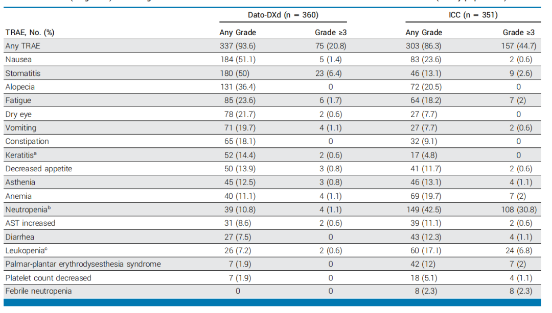 此外,Dato-DXd为中国患者了带来更高缓解率(ORR方面两组分别为38.6%vs17.9%),显著延长至首次后续治疗时间[2]。由此可见,中国人群能够在Dato-DXd的治疗中有更多获益。