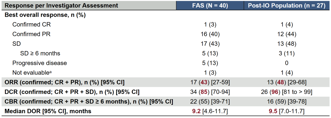 这是一项多中心、单臂、多队列、开放标签的II期临床试验,宫颈癌队列入组了40例对铂类及紫杉类耐药或不耐受的r/mCC患者(全体患者,FAS),其中27例(68%)既往接受过免疫治疗(Post-IO)。
