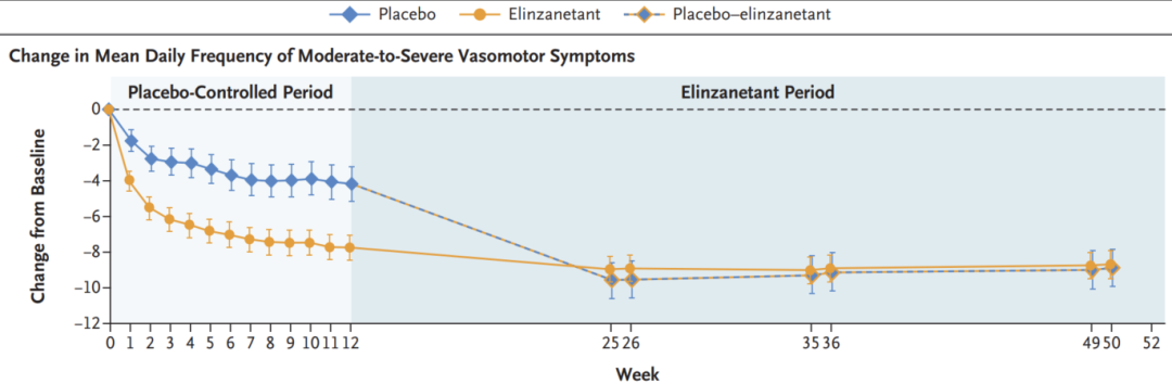 6月2日,《NEJM》在线发表了NK-1&NK-3双重神经激酶拮抗剂依林奈坦(Elinzanetant)治疗乳腺癌内分泌相关血管舒缩综合征(VMS,潮热表现)的OASIS-4研究。该研究为多中心、随机、双盲、安慰剂对照III期临床研究,主要纳入正在接受他莫昔芬/芳香化酶抑制剂±GnRH内分泌治疗的乳腺癌患者,要求每周≥35次VMS。将患者按2:1分为依林奈坦组和安慰剂对照组,安慰剂组治疗12周后改为依林奈坦治疗。结果显示,依林奈坦较安慰剂显著降低中重度VMS的日均发生频率,第4周较基线减少差值分别为-6.5次/日vs-3.0次,P<00.001;第12周较基线减少差值分别为-7.8次/日vs-4.2次/日,P<00.001(图3)。此外,依林奈坦较安慰剂显著改善睡眠障碍,12周PROMIS评分改善差值为-6.1分(P<00.001);显著改善绝经相关生活质量,MENQOL评分改善差值-0.7分。(P<00.001)。在安全性方面,依林奈坦最常见不良事件为头痛、疲劳和嗜睡,严重不良事件发生率较低,前12周为2.5%,安全可耐受。