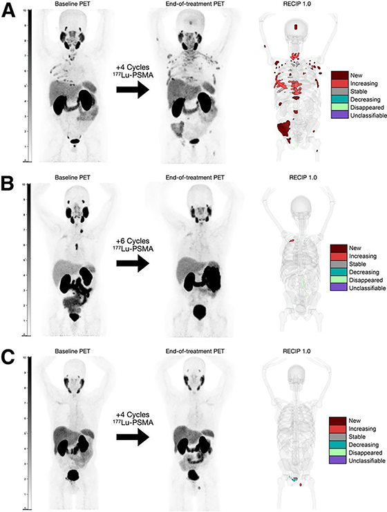 RECIP 1.0旨在将新的病灶外观与PSMA-肿瘤体积变化相结合。在大型多中心数据集的回顾性分析中,RECIP已显示出对总生存和无进展生存的预后价值。RECIP可以使用分割软件进行客观肿瘤体积计算。然而,由于此类工具并非普遍可用,一种可视化替代方案——Visual RECIP——也已得到验证。这有助于其在临床试验和实践中得到更广泛的应用。