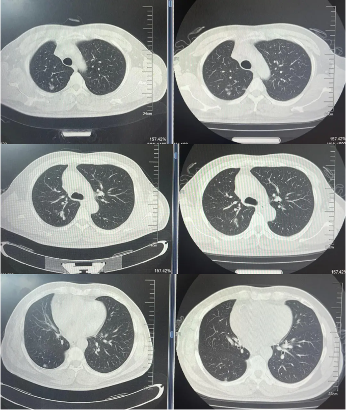 病例2:患者男,61岁。2023年8月于外院行肺CT提示:右肺下叶肿块。2023年10月23日于我院行单孔胸腔镜下右肺下叶切除术、肺门纵隔淋巴结扩清术。术后病理:腺癌低分化(腺泡型占30%,乳头型占30%,筛状占30%,微乳头占10%)。分期pT4N0M0 IIIA期。术后行基因检测提示HER2+(14%),PD-L1 2%+。术后行AC方案化疗4周期后行阿替利珠单抗维持治疗1年。末次用药时间:2024年11月1日。2025年2月复查肿瘤标志物升高,肺HRCT示:双肺多发结节,考虑转移。行血液基因检测提示:ERBB2 35.5%突变,CDK1 9.5%突变,MDM2 4.92%突变。患者DFS 14m,阿替利珠单抗停药后3个月出现复发转移,可见传统免疫治疗效果不佳。恰逢德曲妥珠单抗一线新尝试DESTINY-lung 04研究公布了入组标准和治疗方案,且该患在术后的组织基因检测和复发后的血液基因检测中都明确存在HER2突变,故行德曲妥珠单抗一线治疗。最佳疗效PR,目前治疗持续有效,PFS超过6个月。无药物相关不良反应发生。