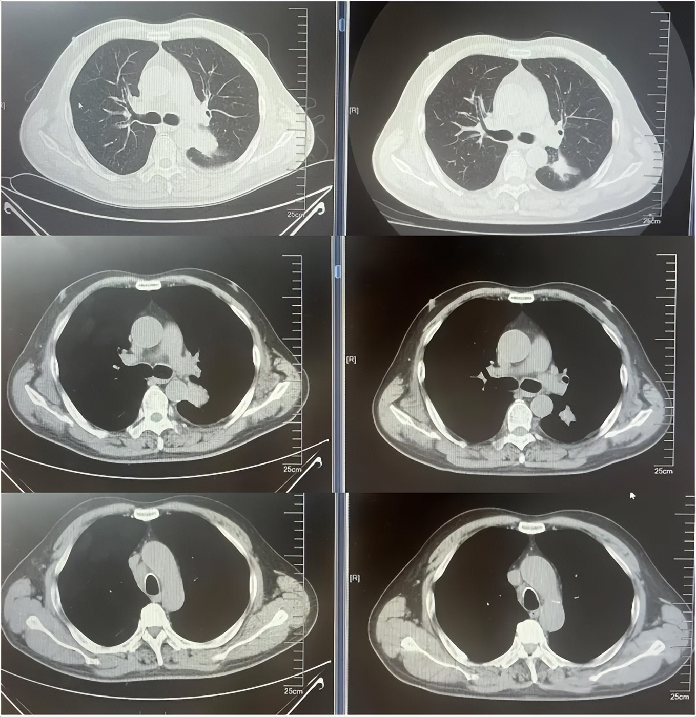 病例1:患者男,68岁。2024年6月以“胸闷气短1个月”为主诉于当地医院检查治疗。查CT提示左肺下叶肿物,纵隔、双肺门多发肿大淋巴结,左侧胸腔积液,左侧胸膜增厚。于当地医院行胸水穿刺引流查癌细胞提示肺腺癌。临床分期:cT2aN3M1a IVA期。患者于当地医院行血液基因检测未见敏感突变,使用AP方案化疗后病情进展。2025-1入我院后行肺穿刺活检,病例提示腺癌。行基因检测提示:ERBB2突变(丰度3.5%)。行德曲妥珠单抗(T-DXd)治疗至今。最佳疗效PR,目前持续有效中,PFS已超过7个月。患者使用德曲妥珠单抗期间出现II级恶心呕吐,经对症治疗可缓解。