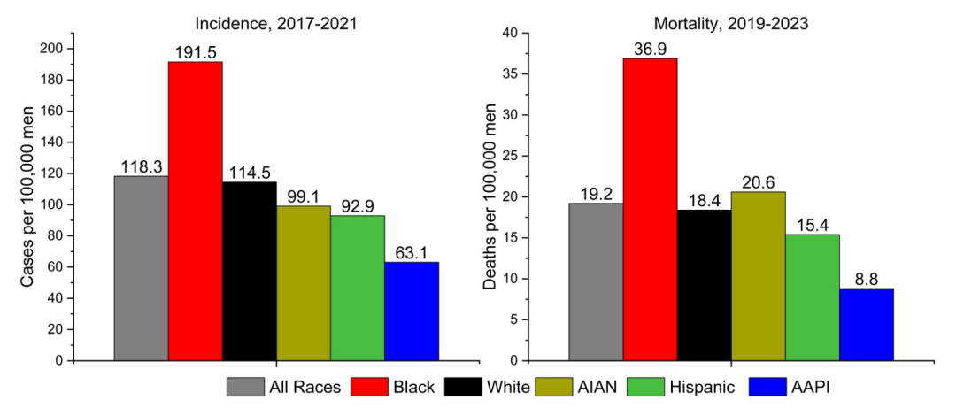 在2000年代后期和2010年代初期大部分时间呈下降趋势之后,美国前列腺癌发病率已持续上升近十年,各年龄段男性中远处转移期疾病的诊断均在增加,包括55岁以下男性每年增加近3%。黑人男性依然承受着最沉重的疾病负担,其死亡率是其他任何种族或民族群体的两倍,而AIAN男性的死亡率虽发病率较低却高于白人男性。晚期诊断病例的增加和持续存在的差异凸显了需要加倍努力以优化早期检测,并解决实现公平结局的障碍,包括改善所有男性获得高质量诊疗的机会。