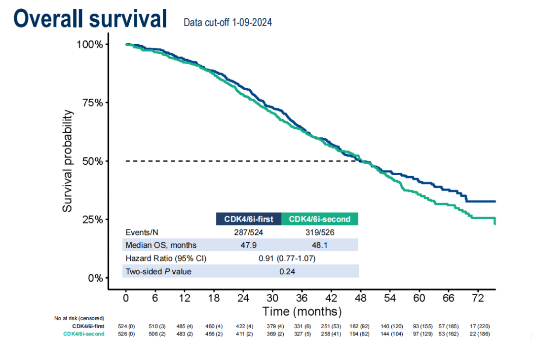 中位随访58.5个月时,共发生606例死亡(58%),263例(25%)患者仍在接受研究治疗。一线CDK4/6i组的中位OS为47.9个月,二线CDK4/6i组为48.1个月(HR 0.91;95%CI:0.77-1.07,P=0.24),未见显著或具有临床意义的差异。