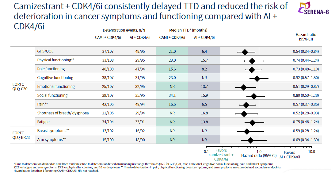 [1].Patient-reported outcomes(PROs)from the SERENA-6 trial of camizestrant(CAMI)+CDK4/6 inhibitor(CDK4/6i)for emergent ESR1m during first-line(1L)endocrine-based therapy and ahead of disease progression in patients(pts)with HR+/HER2–advanced breast cancer(ABC).ESMO 2025.Oral 486MO.