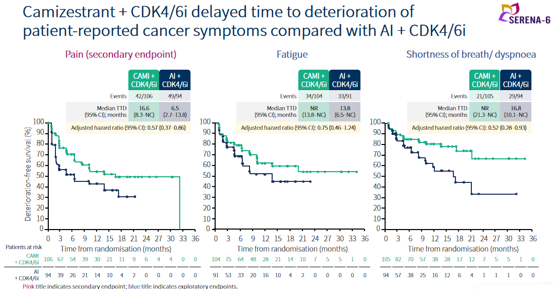 对于晚期乳腺癌患者而言,一线治疗期间因症状轻微多可维持工作,但随疾病进展与治疗毒性累积,正常生活往往难以为继。SERENA-6研究的患者报告结局数据揭示了Camizestrant的一项关键优势:其在GHS/QoL、疼痛、疲劳及呼吸困难指标上均显示出早期、持续的获益。值得注意的是,这些患者主观感受的恶化,实质上可能是临床进展的“前哨指标”。因此,Camizestrant组在这些指标上展现出的延迟恶化,不仅直接转化为患者生活质量的提升,更从临床生物学角度有力地支持了其能有效延缓疾病的有症状进展,从而印证了该疗法更深层的获益优势。