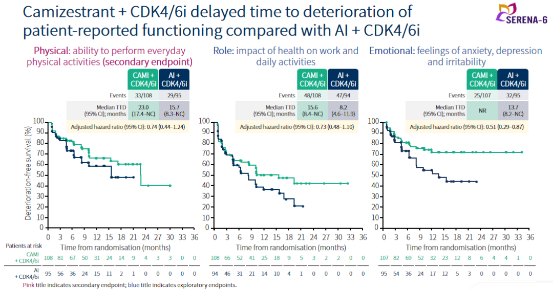 本次报道的身体功能评估包括日常体育活动的能力,如出门散步购物等;角色功能是健康对工作和日常生活的影响,情绪功能衡量了患者是否感到焦虑、抑郁或易怒。与AI组相比,Camizestrant组以上评估指标的TTD尚未达到,意味着超过50%的患者在本次数据截止时没有达到恶化终点,这些数据上的全面优势,为我们描绘出一幅更积极的治疗图景,它不仅在传统疗效终点上表现出色,更重要的是能帮助患者更长久地维持其社会角色、日常功能与情绪健康。对于晚期乳腺癌患者而言,这意味着一种更能平衡疗效与生活质量的治疗选择,其价值远超越单纯的疾病控制。
