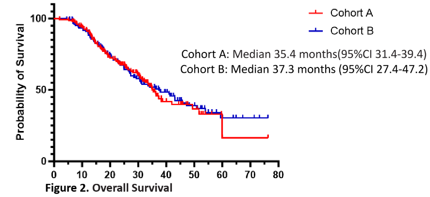 队列A的中位OS为35.4个月(95%CI:31.4-39.4),队列B为37.3个月(95%CI:27.4-47.2),组间差异无统计学意义(p=0.793)。