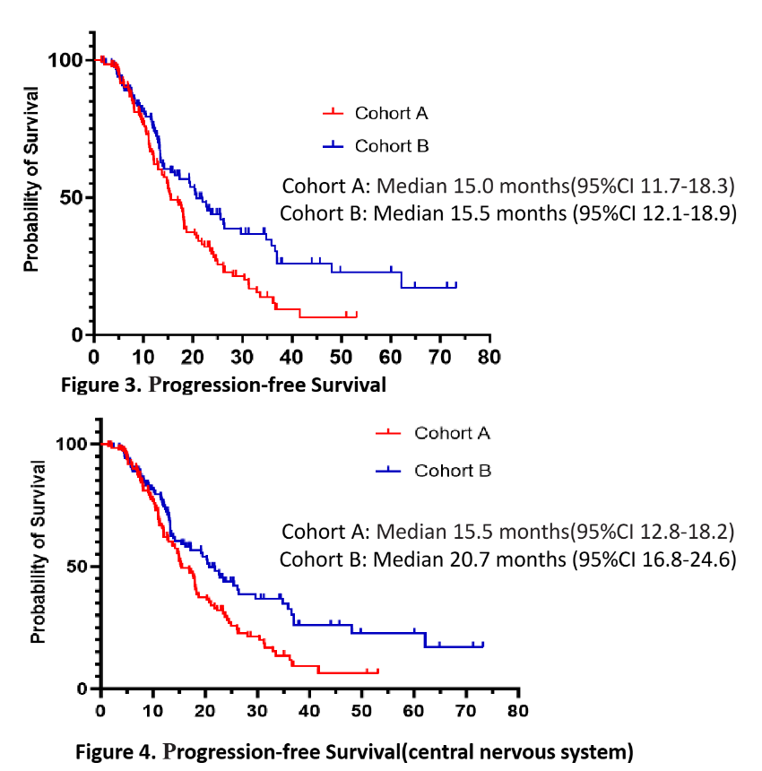 截至2025年5月6日,队列A和队列B的中位随访时间分别为35.9个月(95%CI:34.3-37.5)和45.3个月(95%CI:41.9-48.6)。虽然队列B的CNS-PFS较队列A显著延长(20.7个月vs.15.5个月,p=0.007),但两个队列患者的总体PFS和OS却没有明显差异,队列A与队列B的PFS分别为15.0个月(95%CI:11.7-18.3)和15.5个月(95%CI:12.1-18.9),组间差异同样无统计学意义(p=0.073)。