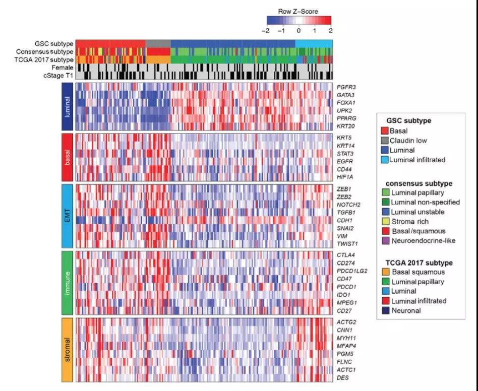 入组患者中,cT1和cT2患者比例分别为42%和58%。研究者首先通过GSC确定了不同分子分型(管腔、基底、EMT、免疫和基质)肿瘤的基因表达热图,如管腔型肿瘤显著表达的标志物为PPARG和KRT20,而基底相关(KRT5和KRT14)、EMT相关(ZEB1和VIM)、免疫相关(CD274和CD8A)和基质相关(MHY11和DES)的标志物表达较低。