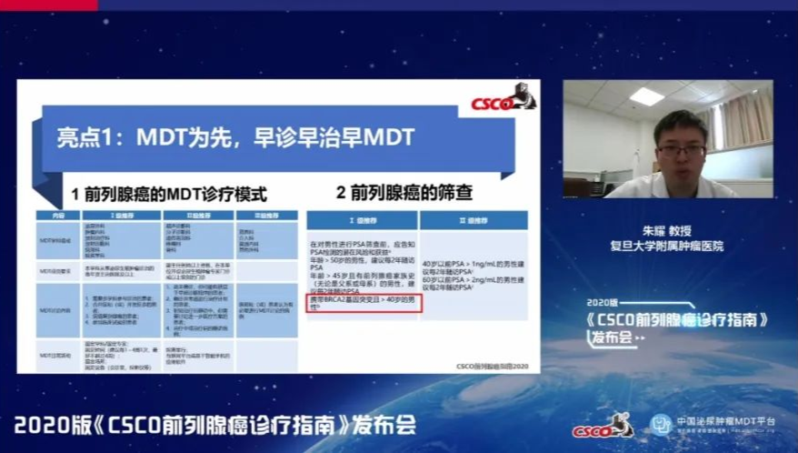 在发布会中,复旦大学附属肿瘤医院的朱耀教授分享了CSCO前列腺癌诊疗指南的撰写流程,证据生成的评价体系,以及本指南的“五大亮点”:MDT为先 ;在大框架下关注前沿 ;易用的分类体系;指南表格化,实用性强;中国数据引领中国指南。“四大特色”:因人而异 ,中西合璧,突破创新,脚踏实地。尤其强调了该版CSCO前列腺癌指南多次引用了基于中国人群相关数据和论文,是一部真正基于中国人群的循证指南。