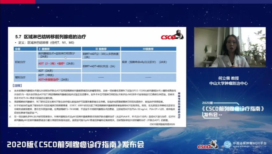 中山大学肿瘤防治中心的何立儒教授分享了“局限性前列腺癌的放射治疗”,提出了放射治疗是前列腺癌根治性治疗手段之一,对于局限期前列腺癌和局部进展期前列腺癌均可达到根治性效果。并且根据指南的推荐,提出了低危组患者采用根治性放疗等效于根治性手术,且安全性良好。对于中危组患者,手术后切缘阳性/包膜外遣/精囊侵犯建议术后进行放疗。而高危患者组:放疗合并2-3年的ADT治疗是1A类证据。