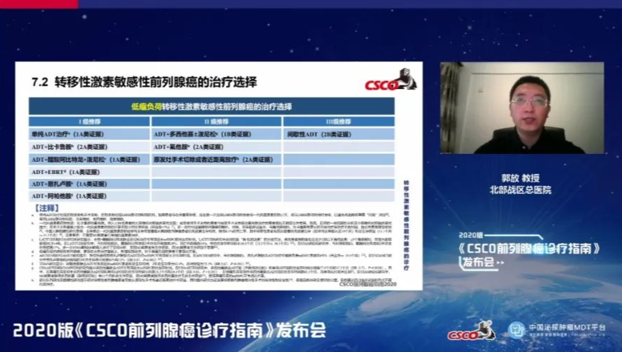 接下来,北部战区总医院的郭放教授分享了“转移性激素敏感性前列腺癌的诊疗”,提出转移性激素敏感性前列腺癌(mHSPC)的预后与患者的肿瘤负荷密切相关。强调应该对mHSPC患者区分高/低瘤负荷进行治疗。本指南在进行治疗推荐时,不仅纳入了最新的临床研究,更充分考虑到了基于中国人群的循证医学证据,对于高瘤负荷和低瘤负荷分别进行了推荐。