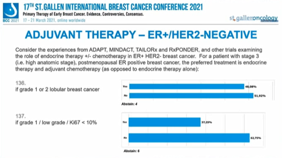 考虑来自ADAPT、MINDACT、TAILORx和RxPONDER以及其他ER+/HER2-乳腺癌内分治疗研究的经验,对于3期(如解剖学分期高)绝经后ER阳性患者的首选辅助治疗是内分泌联合化疗(与单独内分泌治疗相反):