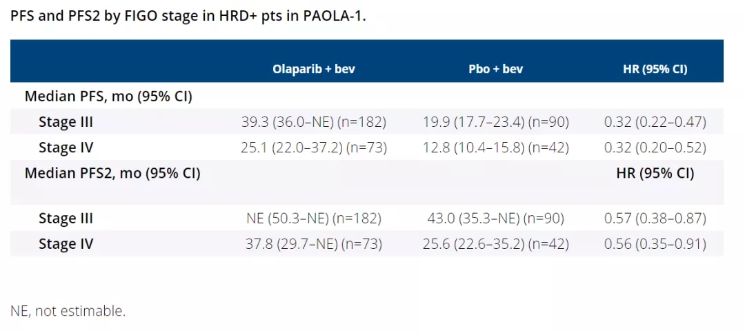 奥拉帕利联合贝伐珠单抗对比贝伐珠单抗维持治疗新诊断晚期卵巢癌III期PAOLA-1研究中不同分期HRD阳性患者的PFS与PFS2结果
