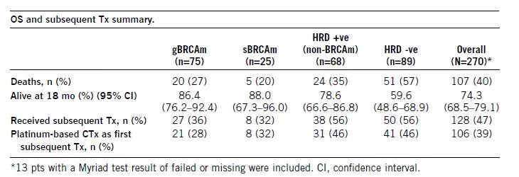 数据截止(DCO)为2020年8月27日,gBRCAm、sBRCAm、HRD+(非BRCAm)、HRD-四个队列的18个月总生存率分别为:86%、88%、79%和60%;