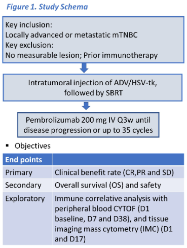 方法:在这项单臂、开放二期试验中,mTNBC患者接受原位溶瘤病毒ADV/HSV-tk (5x1011vp)瘤内注射,然后对注射的肿瘤部位进行SBRT治疗,随后用帕博利珠单抗维持治疗,直到病情进展或出现无法忍受的毒性。主要终点是临床获益率(根据RECIST1.1版对CR、PR和SD进行评估)。次要终点包括治疗的持续时间(DoT)和安全性。同时检测外周血CYTOF(D1、D7和D38),配对活检组织(D1和D17)进行35个细胞表面标志物组织影像细胞术(IMC)检测,以进行免疫相关分析。