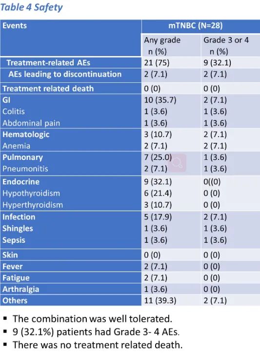 结果:该研究共收入了28位mTNBC患者,18例(64.3%)为PD-L1阴性肿瘤。中位年龄为54岁(34~78岁)。既往化疗中位线数为2(0~6),其中8例(28.6%)接受超过三线化疗,3例(10.7%)有脑转移。6例(21.43%)患者有临床获益,2例CR(7.1%)、1例PR(3.57%)和3例SD(10.7%)。临床获益患者存在持久性,中位DoT为383天(195~1195天)。