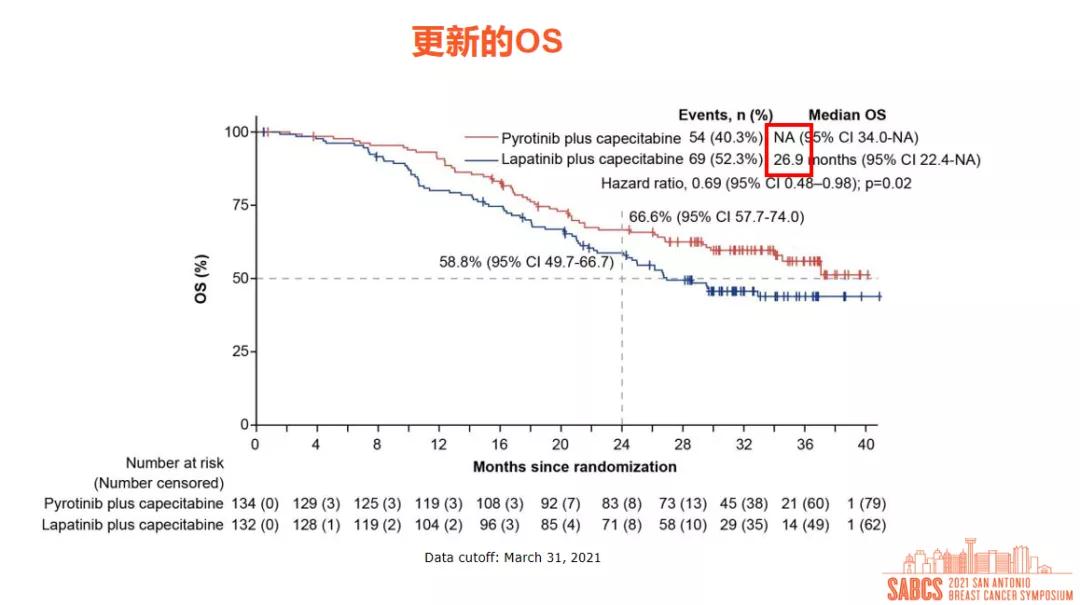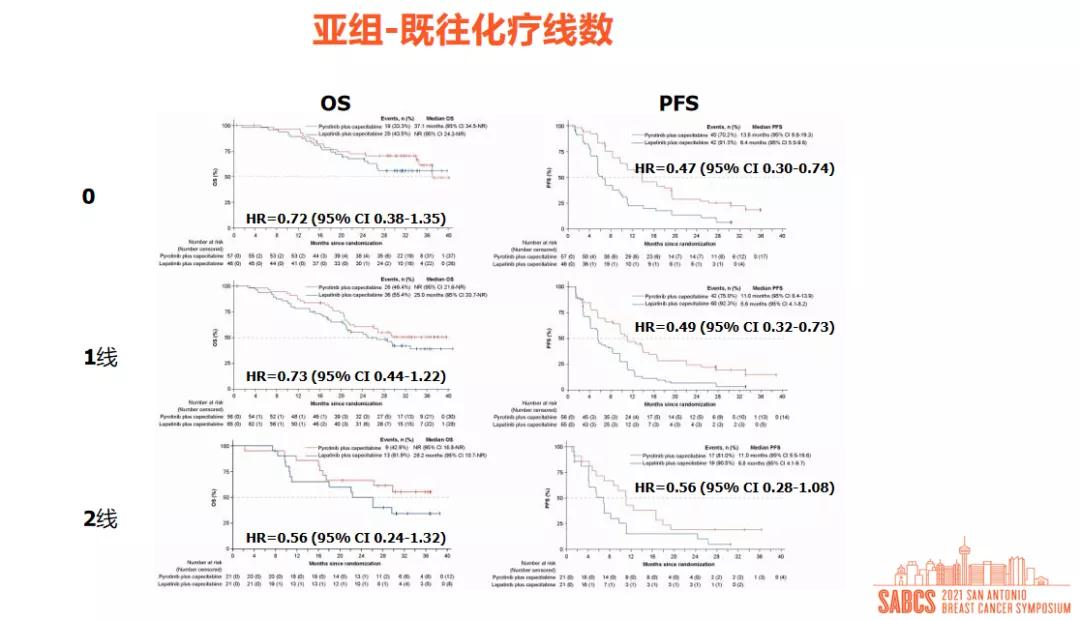 本次SABCS大会报告了该研究的OS数据。至数据截止日期2021年3月31日,吡咯替尼组和拉帕替尼组的中位OS分别为NA和26.9个月(HR 0.69,95%CI:0.48~0.98,P=0.02),2年OS率分别为66.6%和58.8%。亚组分析显示各亚组的获益趋势一致。但无曲妥珠单抗耐药(HR 0.60)患者获益更显著,而既往0线(HR 0.72)、1线(0.73)、2线(0.56)治疗患者的获益趋势一致。