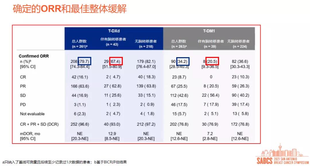 其中,基线伴脑转移(HR 0.25)和无脑转移患者(HR 0.30)的疾病复发和死亡风险分别降低75%和70%;ORR也分别达到了67.4%和82.1%(高于T-DM1组的20.5%和36.6%),显示了T-DXd在脑转移(BM)患者中的良好疗效。