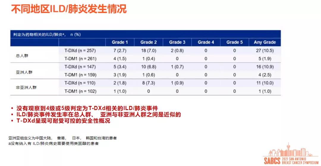 本研究看到T-DXd组安全性表现良好,间质性肺炎/肺炎发生率在亚洲(10.9%)和非亚洲人(10.0%)之间没有区别。DB-03中,ILD总发生率为10.5%,多为1~2级,无4级或5级事件发生,情况明显优于既往DB-01,安全性得到了很大的改善,可能和DB-03研究入组了更多治疗线数靠前的患者,以及近来我们对ILD有更多关注、重视,积累一定预防及治疗经验有关。