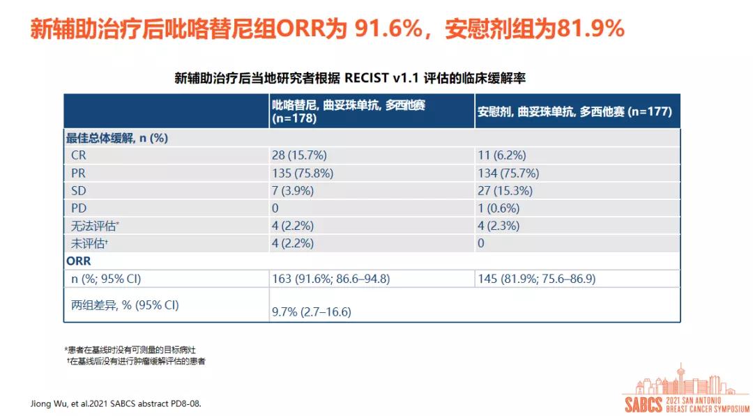 至数据截止日期2021年4月30日,独立评审委员会(IRC)评估的吡咯替尼组tpCR(ypT0/is,ypN0)率相较安慰剂组显著提高19%(41.0% vs 22.0%,P<0.001),bpCR(ypT0/is)率提高20.1%(43.8% vs 23.7%)。当地病理学家评估的tpCR率则分别为44.4%和24.3%。新辅助治疗后吡咯替尼组和安慰剂组的ORR分别为91.6%和81.9%。