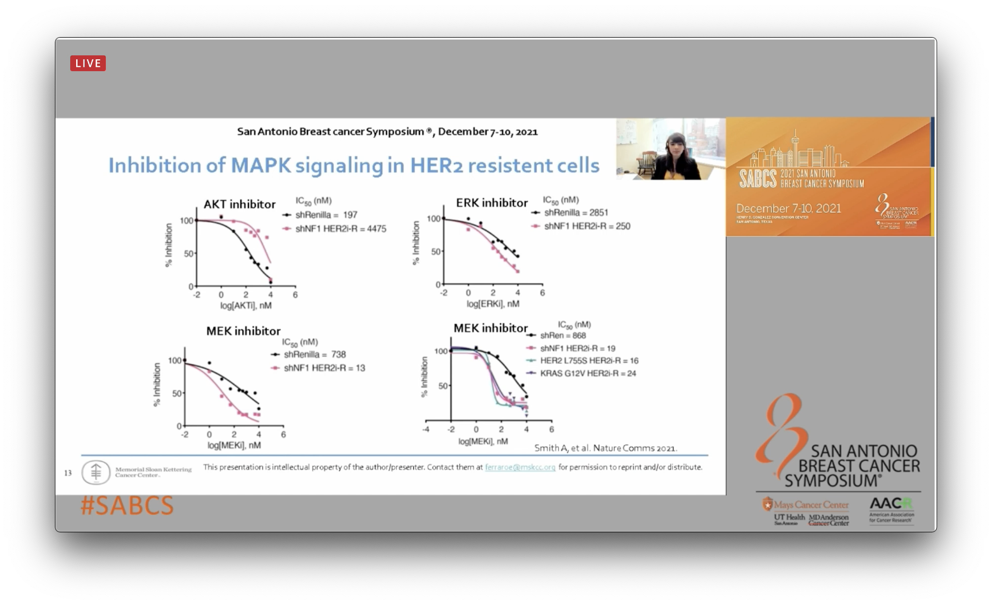 本次大会发表的GS3-03结果中,不仅仅观察到与其一致的现象即晚期HER2阳性乳腺癌患者PIK3CA突变会导致较差生存获益,更重要的是,观察到MAPK通路改变与不良预后相关的研究结果。尽管仅有145例样本的生存分析,但在体内和体外实验中,MAPK通路参与抗HER2耐药机制的新发现为抗HER2治疗耐药打开了新的局面。该研究的创新性在于首次确定MAPK通路改变是抗HER2治疗耐药的额外潜在驱动因素。抑制这类肿瘤中的PI3K或MAPK通路可能代表着一种新的治疗策略,以协助双靶治疗获得更好的效果。未来是否能将MAPK通路相关分子与液体活检相结合,以便为我们提供更多的精准治疗的思路。另外,此类研究提示我们,根据临床病史和基因组数据获得的重要信息可为乳腺癌患者开发出新型克服耐药的治疗策略。