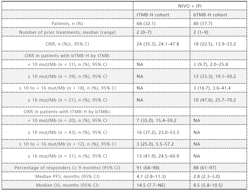 总之,NIVO+IPI在肿瘤TMB-H或血液TMB-H晚期或转移性实体瘤且对标准治疗无效的患者中显示出可管理的安全性,而且在肿瘤TMB-H患者中观察到疗效增加。