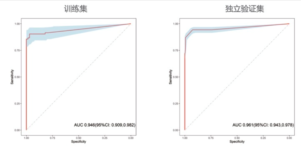 我中心联合天津医科大学第二医院,在金橡医学的技术支持下,利用NGS技术研究尿液游离DNA在尿路上皮癌的诊断以及治疗监测中的应用[4]。研究回顾了181对膀胱癌基因检测数据进行肿瘤特征筛选,入组150例膀胱癌患者以及76例正常对照尿液样本作为算法(utLIFE-UC)开发的训练集,其后前瞻性入组674例拟诊膀胱癌患者以及22例拟诊上尿路尿路上皮癌患者作为验证集进行敏感性和特异性验证;结果发现utLIFE-UC的诊断敏感性为92.8%,特异性为96.0%,诊断准确性为94.3%,AUC为0.96(图3);在NMIBC、MIBC以及UTUC的诊断方面优于同期进行的尿细胞学检查。另一针对MRD的研究中,入组接受新辅助治疗(包括化疗和/或免疫治疗)前、治疗中和治疗后(手术前)的尿液样本进行utLIFE-UC检测(其中训练集16例,验证集15例),以根治病理结果作为金标准;发现尿液游离DNA预测pCR的阴性预测价值(即能够准确发现未达pCR的患者)为100%,优于同期进行的尿细胞学(100% vs.37.5%,P=0.0070)和FISH检测(100 vs. 42.9%,P=0.0125)。