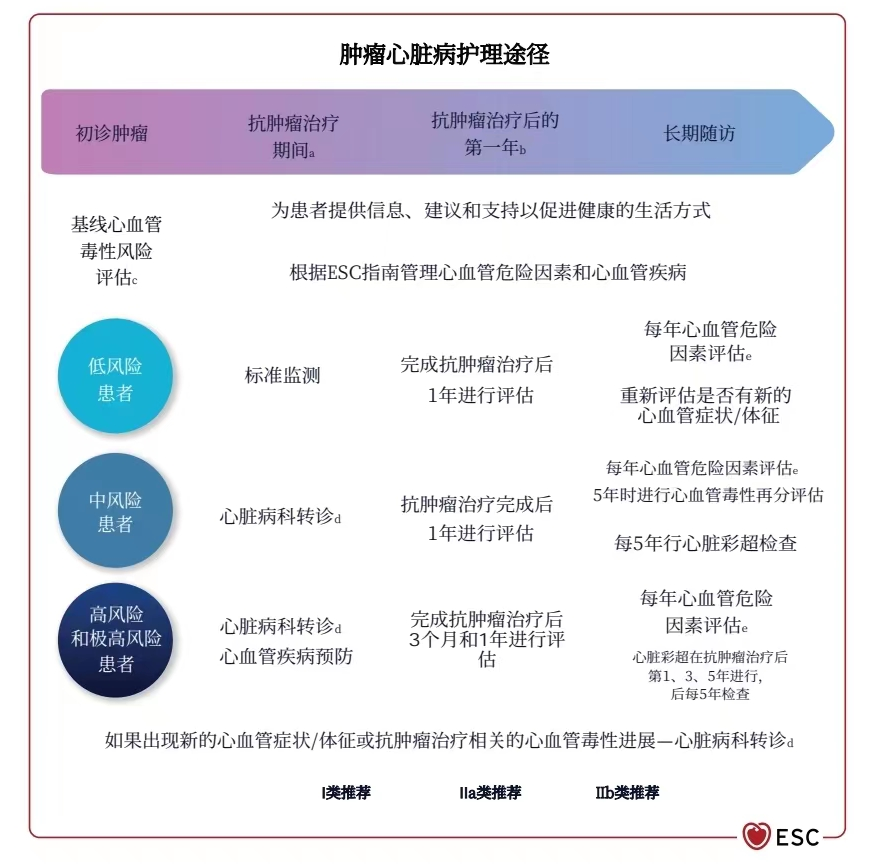 通过不同的危险分层,将病人划分为低中高风险患者,从初诊肿瘤,抗肿瘤治疗期间,抗肿瘤治疗后的第一年和长期随访做出了I II III类推荐。