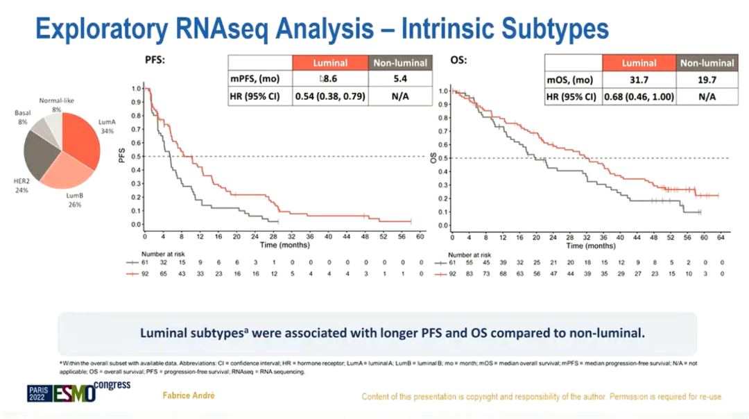 利用RNA测序分析内在亚型探索性分析显示,可以将患者分为管腔亚型和非管腔亚型,两者PFS(8.6个月 vs 5.4个月【HR 0.54,95%CI:0.38~0.79】)和OS(31.7个月 vs 19.7个月【HR 0.68,95%CI:0.46~1】)结果显示,管腔亚型三阳性患者PFS和OS较非管腔亚型显著延长。阿贝西利+曲妥珠单抗+氟维司群联合治疗组3级以上腹泻发生率为9%,3级以上中性粒细胞减少发生率为27%,安全性与既往报告一致。