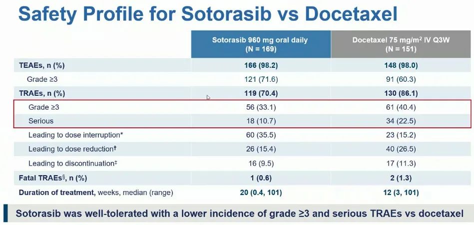 药物安全性方面,sotorasib优于多西他赛,≥3级治疗相关不良事件(TRAE)发生率分别为33.1%和40.4%,严重TRAE发生率分别为10.7%和22.5%。