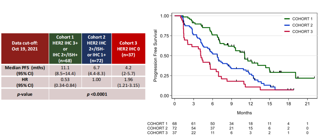 ITT人群中位DoR为8.5个月,HER2过表达队列为9.7个月,HER2低表达队列为7.6个月,HER2不表达队列为6.8个月。ITT人群中位PFS为7.0个月,HER2过表达队列为11.1个月,HER2低表达队列为6.7个月,HER2不表达队列中位PFS为4.2个月。