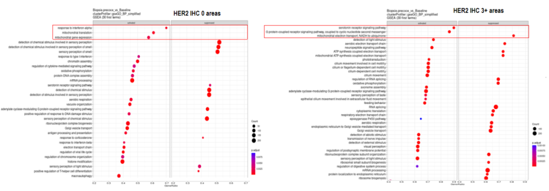 2022年ESMO BC大会上,DAISY研究患者生物标志物分析结果披露。研究者通过免疫组化(IHC)(HER2、gH2AX)对基线和治疗期间10例肿瘤活检的旁观者效应和T-DXd摄取情况进行了分析。采用多种免疫荧光(CD3、CD4、CD8、CD68、FoxP3、PD-1、PD-L1、CK/SOX10抗体)检测T-DXd在基线和治疗中的配对样本(22天或43天,n=31例)来明确其对免疫细胞调节作用。通过全外显子组测序(n=24)和免疫组化(n=25),分析了原发性和继发性耐药机制。利用人工智能(AI)对基线时HER2阳性切片图像进行分析,研究HER2空间分布的预测价值。