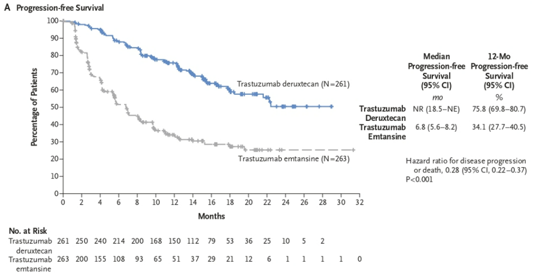 张剑教授:众所周知,Destiny系列研究结果都是非常出众的。Destiny-Breast03研究头对头对比了T-DXd与T-DM1用于既往接受过曲妥珠单抗和紫杉类治疗的HER2阳性晚期乳腺癌的疗效与安全性。结果显示,T-DXd组与T-DM1组相比,研究者评估的中位无进展生存期分别为25.1个月vs 7.2个月,12个月的PFS率分别是75.8%vs 34.1%(HR=0.28;95%CI:0.22~0.37;P<0.001),亚组分析显示,在所有亚组中,T-DXd均优于T-DM1,这一结果也提示,未来T-DXd将会成为HER2阳性晚期乳腺癌患者的二线治疗标准方案。