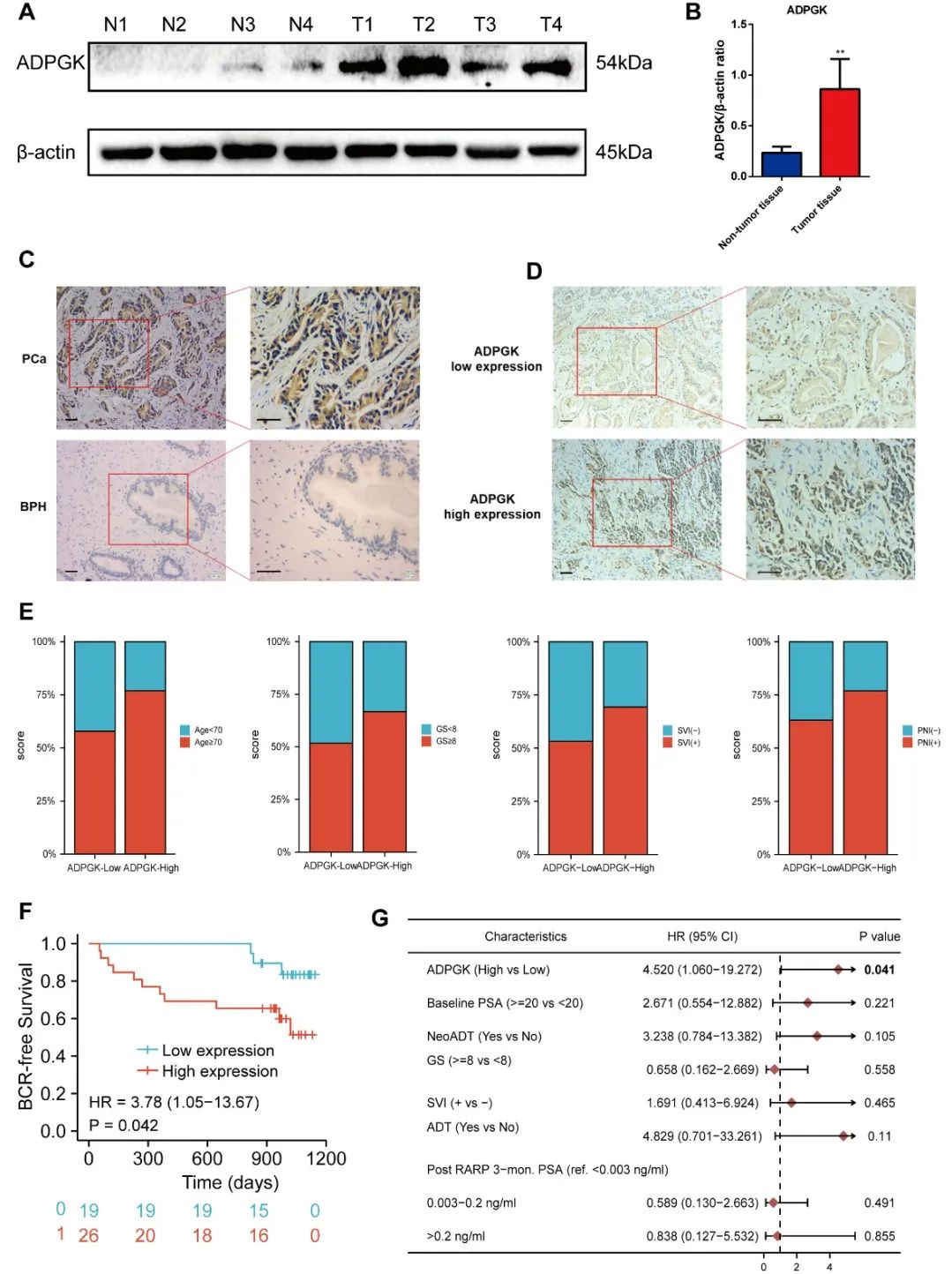 研究结果显示,ADPGK在前列腺癌组织中高表达(图1A-C)。ADPGK高表达的前列腺癌患者生化复发时间更短(图1D-G)。