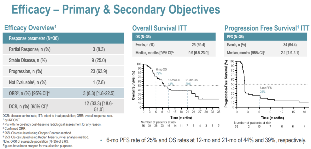 在2022年12月31日的数据截止点,中位OS为9.9个月(95%CI:6.5-23.0),有25个OS事件(69.4%),12个月OS率为44%,21个月OS率为39%。Majem在演讲中说,该联合方案的21个月OS率相比多西他赛等药物在此类患者中获得的10%-15%21个月OS率(取决于组织学类型)历史数据是有利的。[2,3]