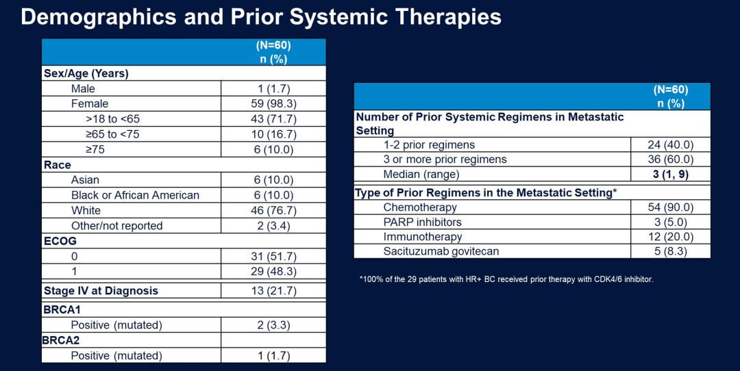 这项研究的A部分入组患者为HER2-晚期乳腺癌,其中HR+患者既往接受过0-2线化疗和内分泌+CDK4/6抑制剂治疗;TNBC患者接受过1-3线化疗。研究的主要终点是ORR和6个月无进展生存(PFS)率。