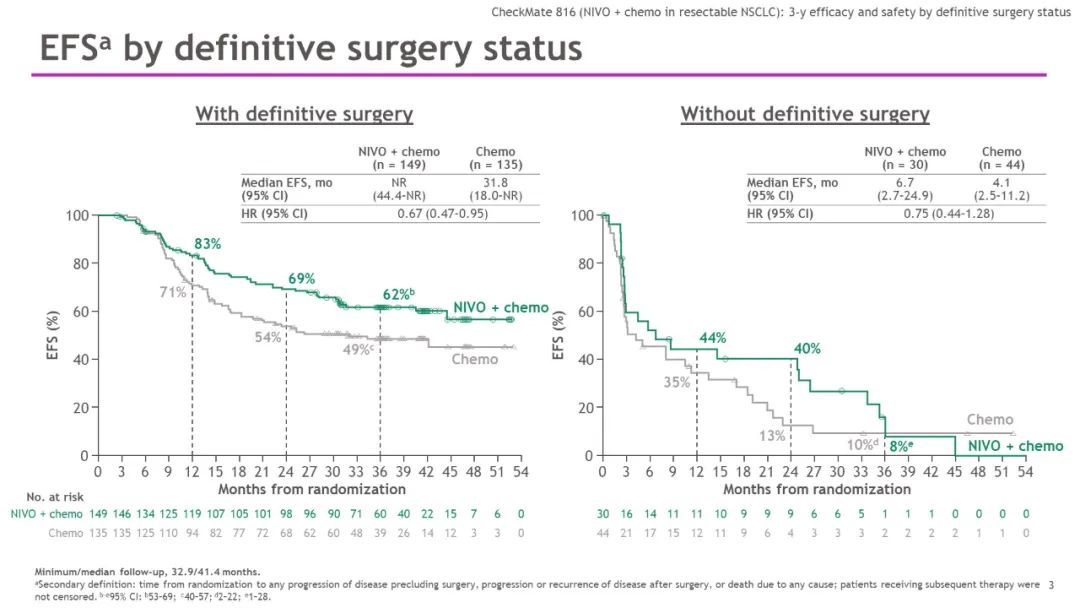 不论治疗组如何,与未接受手术治疗相比,接受手术患者的EFS、至死亡或远处转移时间(TTDM)和 EFS2在数值上更优。在免疫联合组完成最终手术的患者中,中位EFS尚未达到(95% CI: 44.4-未达到[NR]),而单独化疗组为31.8个月(95% CI: 18.0-NR)(HR=0.67;95% CI: 0.47-0.95)。