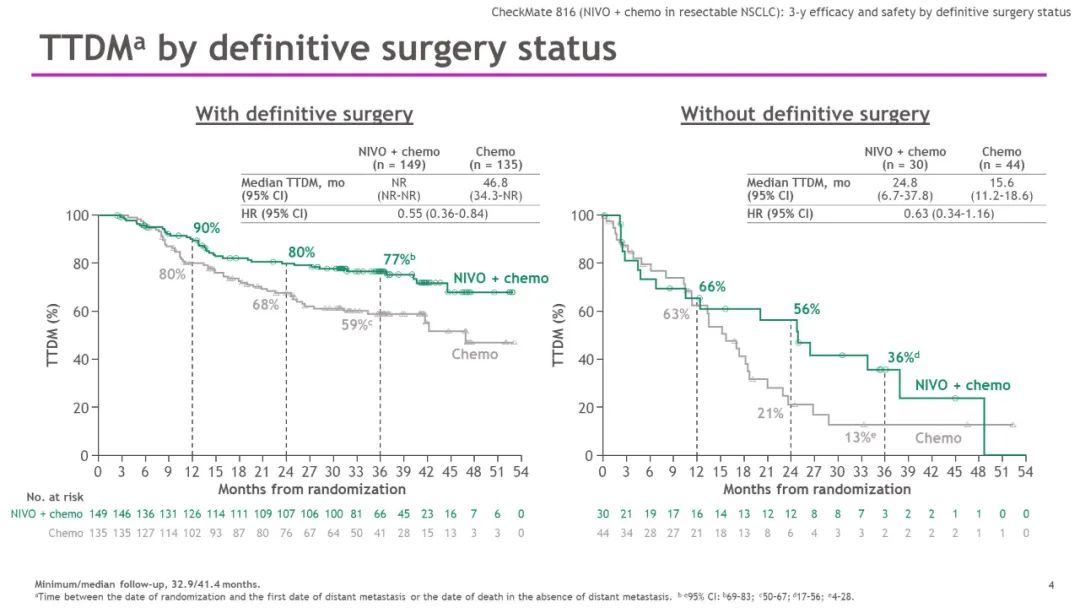 在接受手术治疗的患者中,免疫联合组和化疗组的中位TTDM分别为未达到和46.8 个月(HR=0.55),3年TTDM率分别为77%和59%。在未接受手术的患者中,免疫联合组和化疗组的中位 TTDM分别为 24.8个月和15.6个月(HR=0.63),3年TTDM率分别为36%和13%。