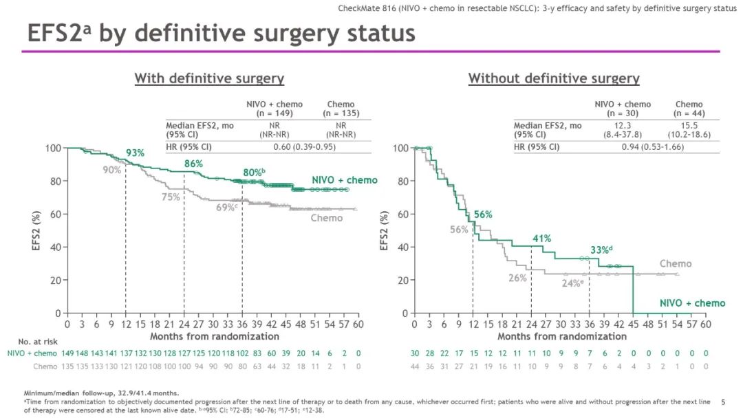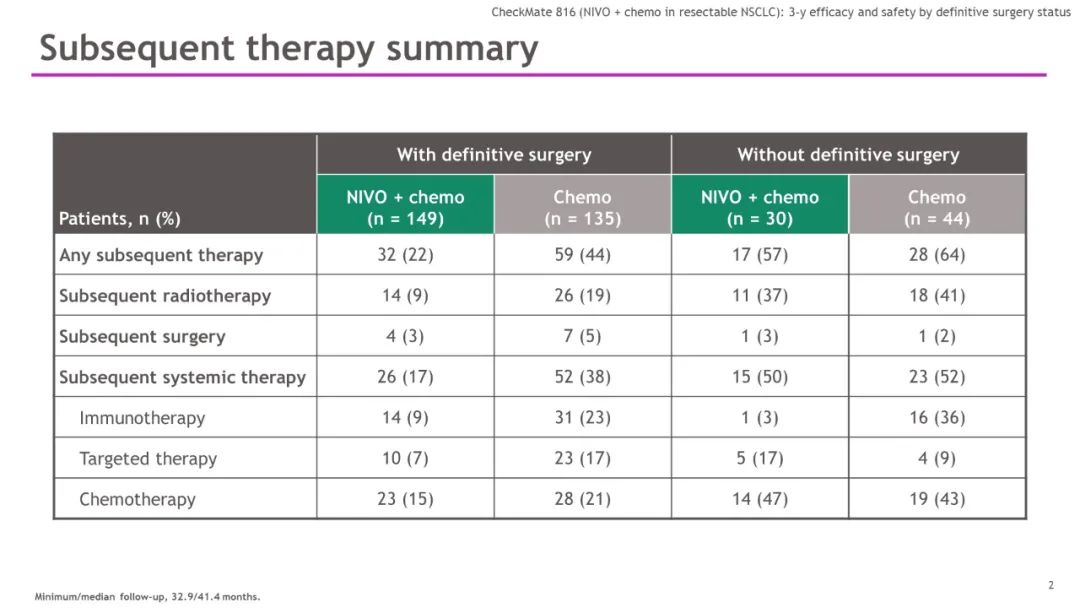 这项报告介绍了患者在未接受手术时接受的实际治疗。两组中大约60%的患者接受了后续治疗,其中很大部分患者接受了放疗,大约一半患者的后续治疗是系统治疗。CheckMate-816此次发布的结果有助于解决一个悬而未决的问题,即那些最终没有接受手术的患者会发生什么,结果表明即使是在未接受手术的患者亚组,纳武利尤单抗+化疗组的患者临床结局也更有利。