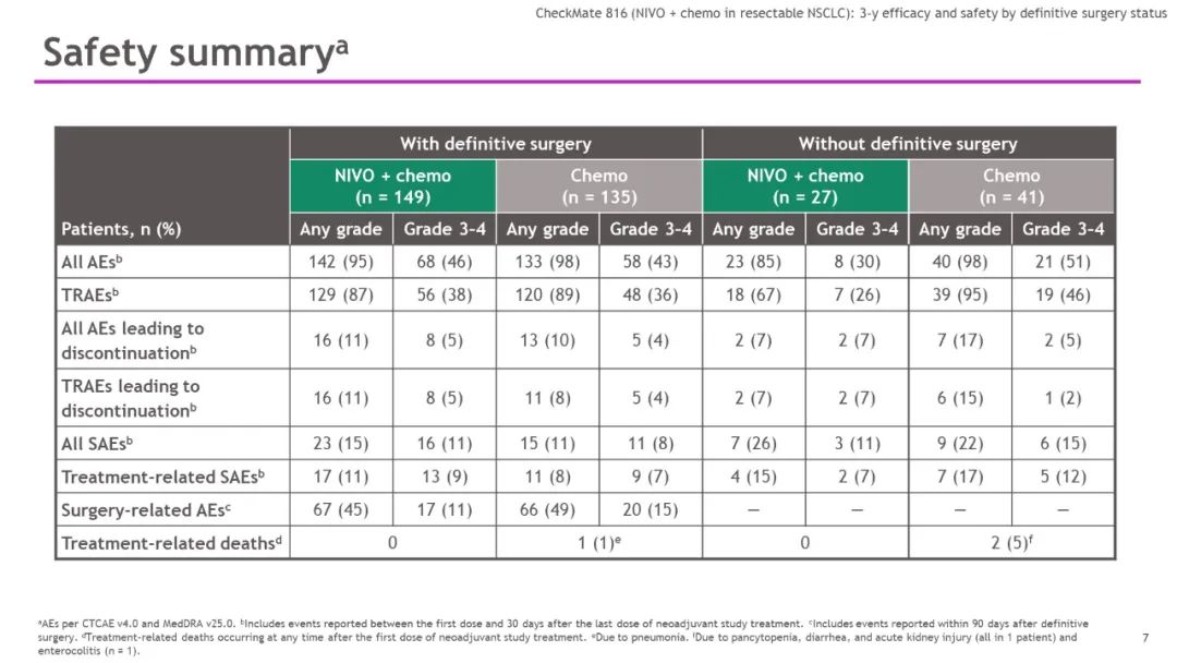 在接受手术治疗患者中,免疫联合组和化疗组分别有38%和36%患者发生3/4级治疗相关不良事件(TRAE),分别有11%和8%的患者经历了3/4级治疗相关严重不良事件(SAE);未接受手术患者中,两组的3/4 级TRAE发生率分别为26%和46%,分别有11%和15%的患者报告了3/4级SAE。