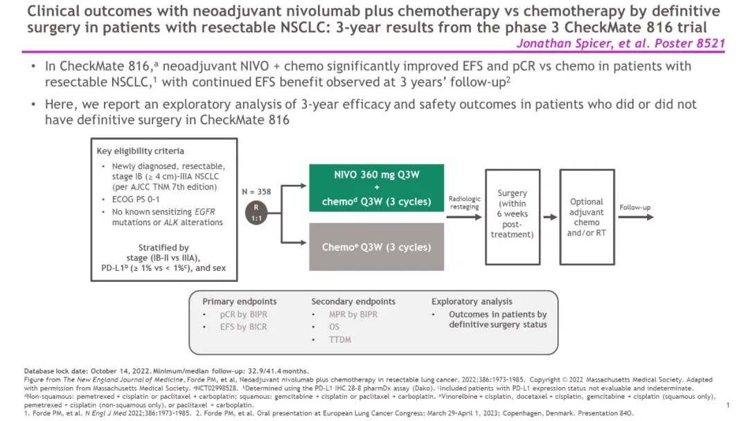 Spicer J, et al.Clinical outcomes with neoadjuvant nivolumab (N) + chemotherapy (C) vs C by definitive surgery in patients (pts) with resectable NSCLC: 3-y results from the phase 3 CheckMate 816 trial. Abstract 8521, 2023 ASCO.