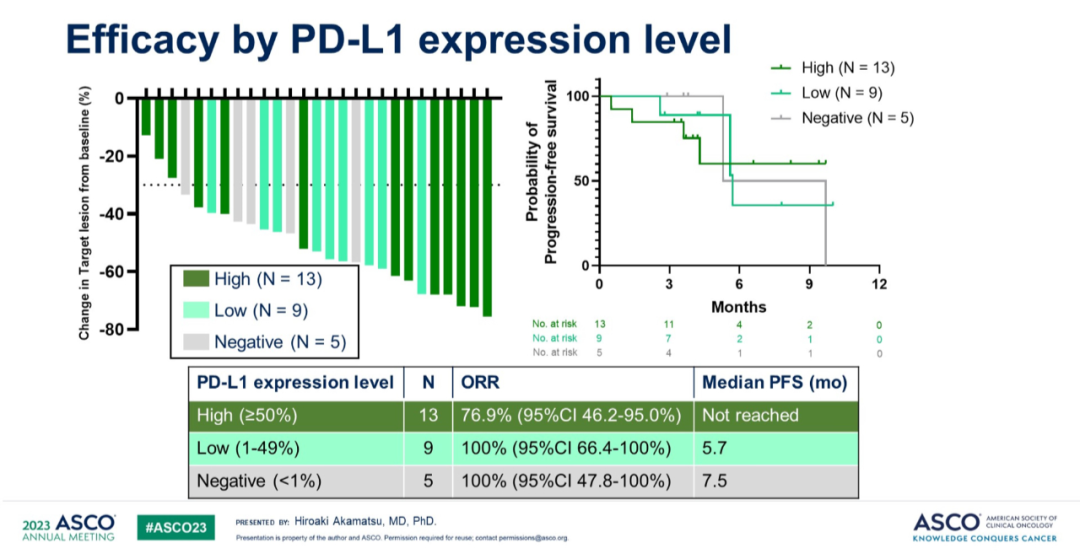 亚组分析显示,不同PD-L1表达水平患者的ORR差异无统计学意义,PD-L1表达≥50%、1-49%和<1%患者的ORR分别为76.9%、100%和100%;中位PFS为尚未达到、5.7个月和7.5个月。