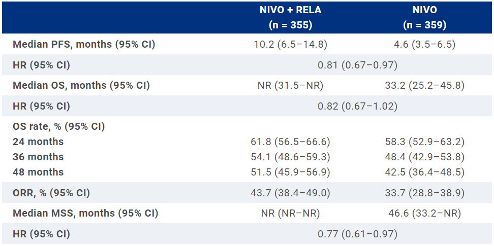 在RELATIVITY-047研究(NCT03470922)中,与NIVO单药相比,NIVO+RELA具有统计学意义上的无进展生存期(PFS)获益;虽然总生存期(OS)没有统计学意义,但也有观察到改善。经过盲态独立中心审查委员会(BICR)评估,NIVO+RELA的客观反应率(ORR)也比NIVO单药高。在本研究报告了最新的描述性分析(疗效、安全性和二次分析),并进行了长期(约2年)的随访。