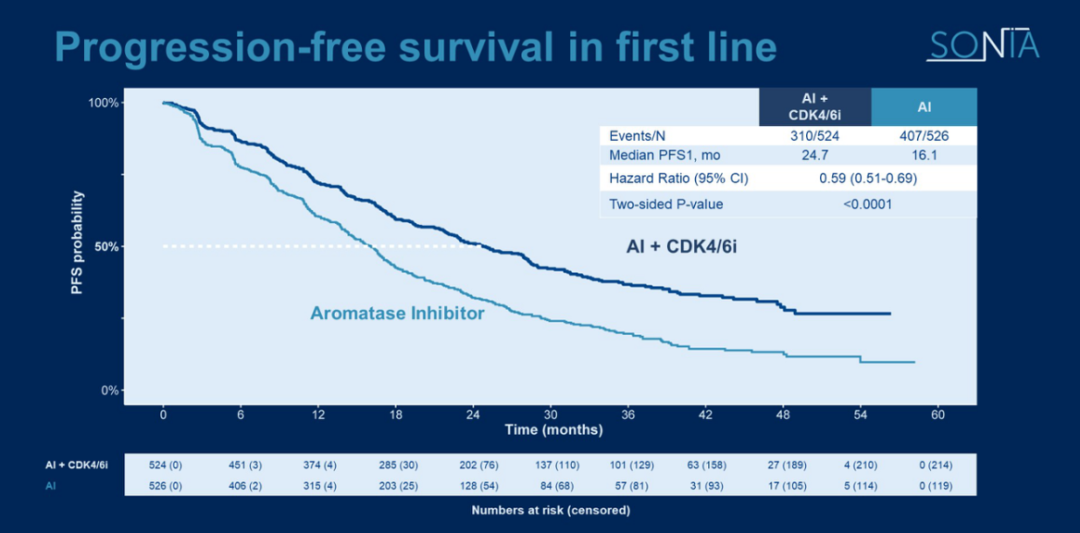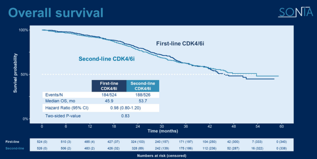 从SONIA研究中我们可以看到,一线治疗中NSAI+CDK4/6抑制剂对比单药NSAI是有PFS获益的,但是没有达到显著的统计学差异,因此,患者也没有达到总生存获益。SONIA研究中,有91%的患者应用的是哌柏西利,我认为患者没有得到总生存获益可能与治疗中应用的CDK4/6抑制剂种类有关。这正如刚才我提到的,在HR+晚期乳腺癌一线治疗中,不同研究中应用的CDK4/6抑制剂不同,患者的最终总生存获益情况也存在差异。患者后线治疗的最佳方案,也需要我们进行进一步的探索,最终使患者得到更好的生存获益。