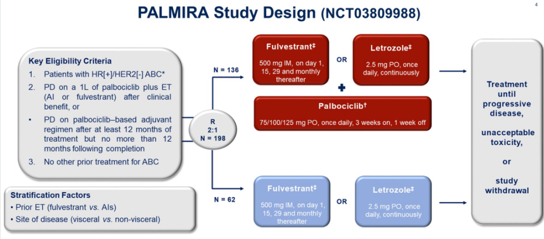 PALMIRA研究共纳入了198例HR+/HER2-ABC患者,这些患者均在一线使用哌柏西利联合ET(芳香化酶抑制或氟维司群)治疗后发生疾病进展。在2019年4月至2022年10月期间,198例患者分别按照2∶1比例被随机纳入了联合治疗组(氟维司群/来曲唑+哌柏西利;N=136)和单独治疗组(氟维司群/来曲唑;N=62),两组患者的基线特征相似。入组患者的中位年龄为59岁(范围为33~85岁),61.1%的患者ECOG评分为0,61.1%的患者存在内脏疾病。在治疗方面,89.9%的患者在一线治疗中使用了芳香化酶抑制剂+哌柏西利。主要终点为研究者根据RECIST V.1.1评估的PFS。