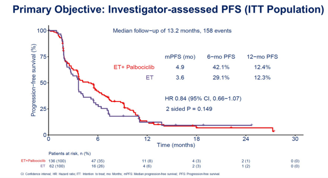 中位随访13.2个月,发生了158个PFS事件之后,研究者评估的联合治疗组和单独治疗组的中位PFS时间分别为4.9个月和3.6个月(HR=0.84,95%CI:0.66~1.07;P=0.149)。虽然联合治疗组相比单独治疗组的患者中位PFS在生存时间上有获益,但却没有统计学差异。联合治疗组和单独治疗组的6个月的PFS率分别为42.1%和29.1%,12个月PFS率分别为12.4%和12.3%。也就意味着12个月时,继续应用哌柏西利的获益越来越少,几乎看不到联合治疗组的PFS获益。